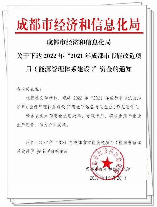 近日,我司荣获“2021年成都市节能改造项目(能源管理体系建设)”资金奖励。