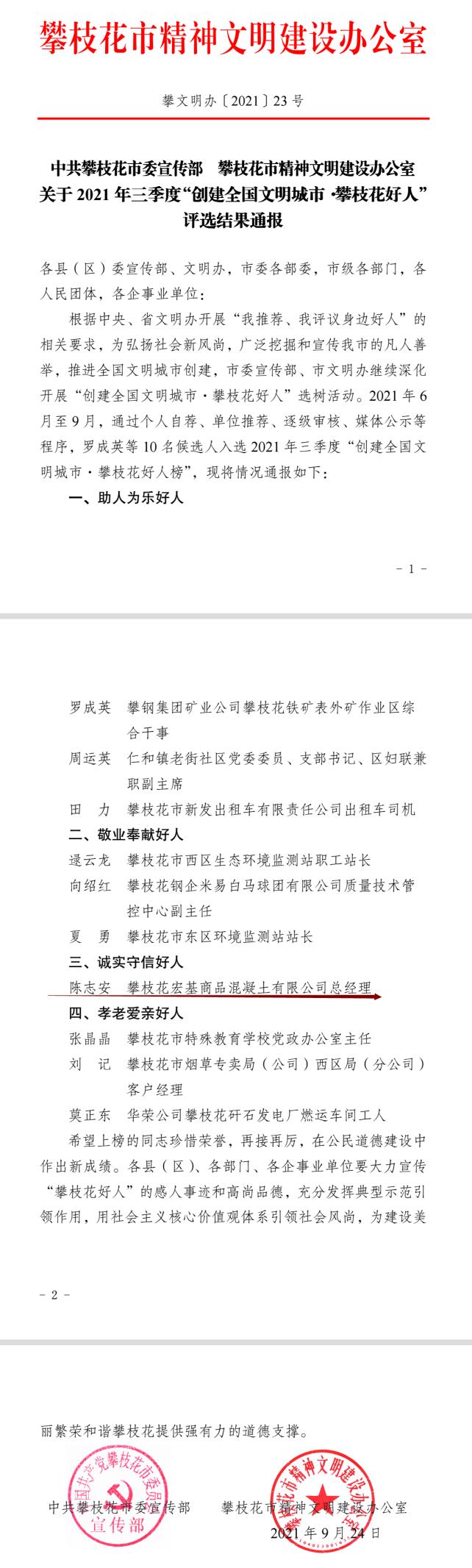 bevictor伟德子公司攀枝花bevictor伟德商品混凝土有限公司总经理陈志安同志获评“诚实守信好人”。