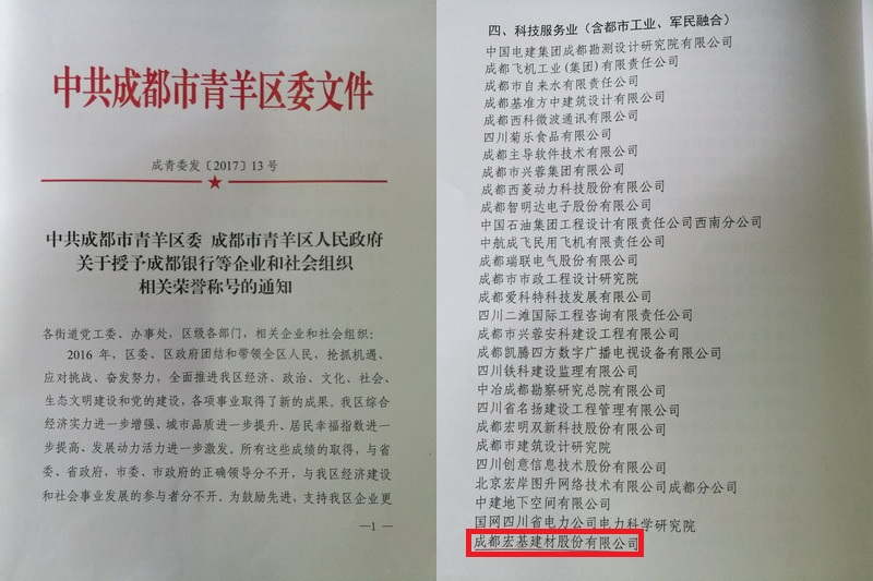 2017年8月8日,成都市青羊区产业发展暨投资促进大会举行,大会授予了企业及社会组织:“青羊区2016年度纳税20强领军企业”、 “青羊区2016年度地方贡献突出企业”、 “青羊区优秀总部企业”、 “青羊区2016年度成长型创新型企业”、 “青羊区专业特色楼宇”、 “青羊区2016年度最具影响力社会组织”荣誉称号。