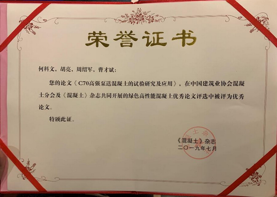 2019年7月15日—18日由全国混凝土协会指导、《混凝土》杂志社联合各省市协会于福建省厦门市举办“预拌混凝土行业绿色生产前沿技术及管理研讨会暨混凝土企业绿色智能生产现场观摩会”。在期间召开的绿色高性能混凝土优秀论文表彰会上,由我司何科文、胡亮、周邵军、曹才斌共同完成的《C70高强泵送混凝土的试验研究及应用》在中国建筑业协会混凝土分会及《混凝土》杂志共同开展的绿色高性能混凝土优秀论文评选中被评为优秀论文。我司员工李俊、周邵军代表公司参会并受奖。