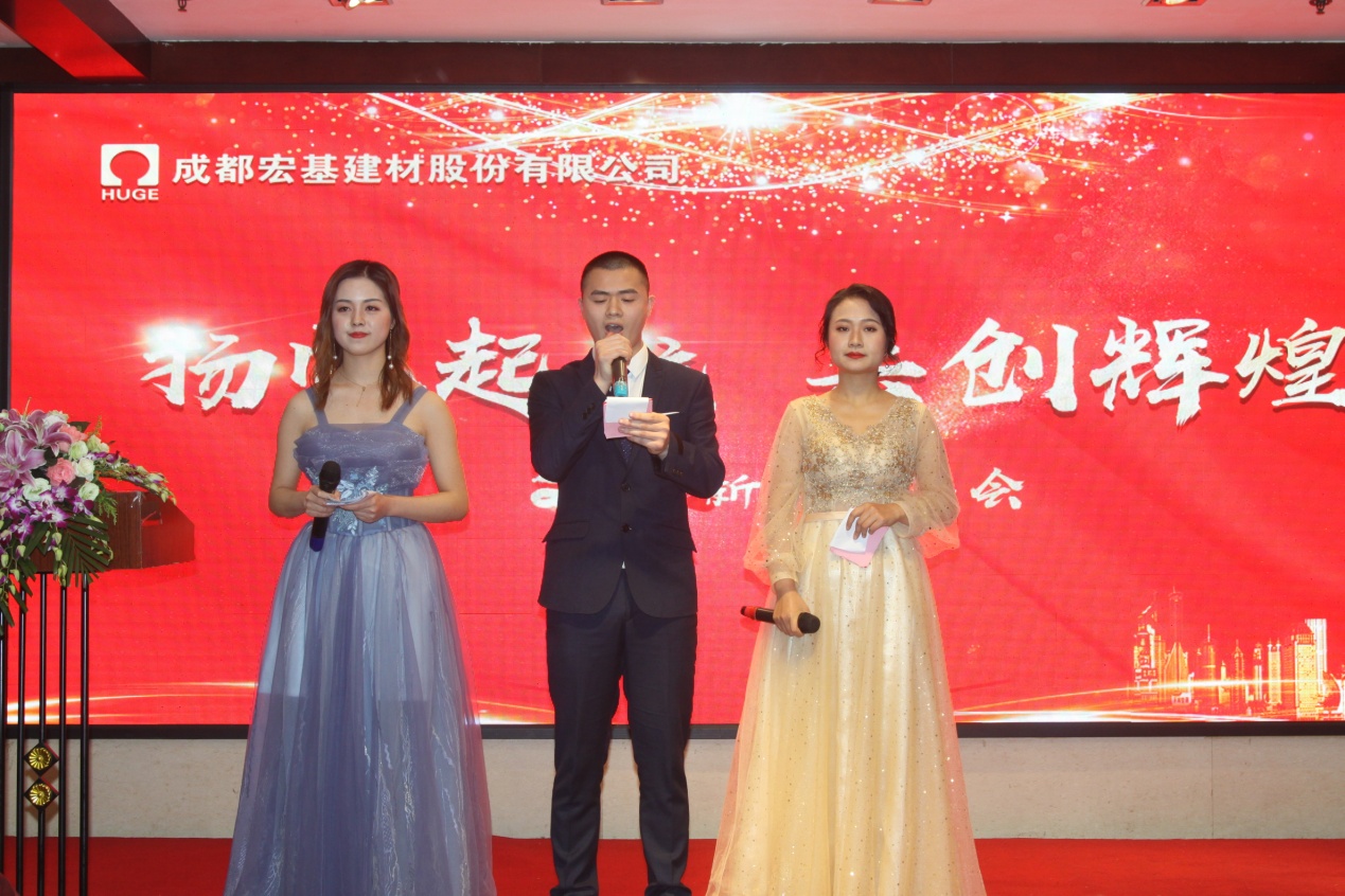 随着舞台中央大屏幕上滚动播放的视频,带着我们回顾着2019年的点滴:天府新区日产量6864.6方混凝土,刷新单站日产量最高记录,公司开展多种活动庆祝新中国成立70周年……。团拜会上,公司董事长兼总裁吴逸云先生首先致新春贺词:2019年我们实现产值18亿元、砂石精加工生产车间在郫县建成投产、升级生产和管理系统,实现了远程生产控制、荣获两项由省科学技术厅颁发的“国内领先”技术成果证书,公司注册地址变更……代表公司股东会和董事会感谢所有员工一年的辛勤付出,并祝全体员工及家属新年愉快、阖家幸福!