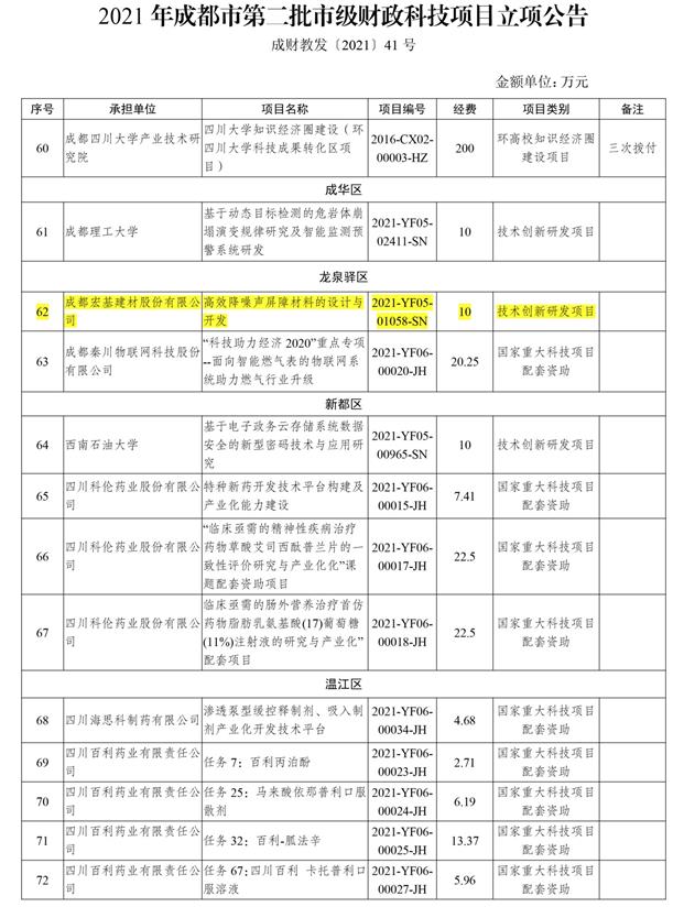 我司技术管理部申报的成都市财政科技项目《高效降噪声屏障材料的设计与开发》成功获得立项批复。我司作为该项目的主办单位,同济大学材料学院为联合单位,共同开展该项目相关工作,此项目可将装配式高性能降噪声屏障材料的创新性理论、关键性新技术、新产品和新生产线快速实现产业化,并推广市场应用,为企业提升新生产力,为成都市“十四五”时期实施的“幸福美好生活十大工程”提供重要的科技支撑。标志着公司在产学研合作方面又取得实质性的成果,在政府科技项目方面也实现了新的突破。