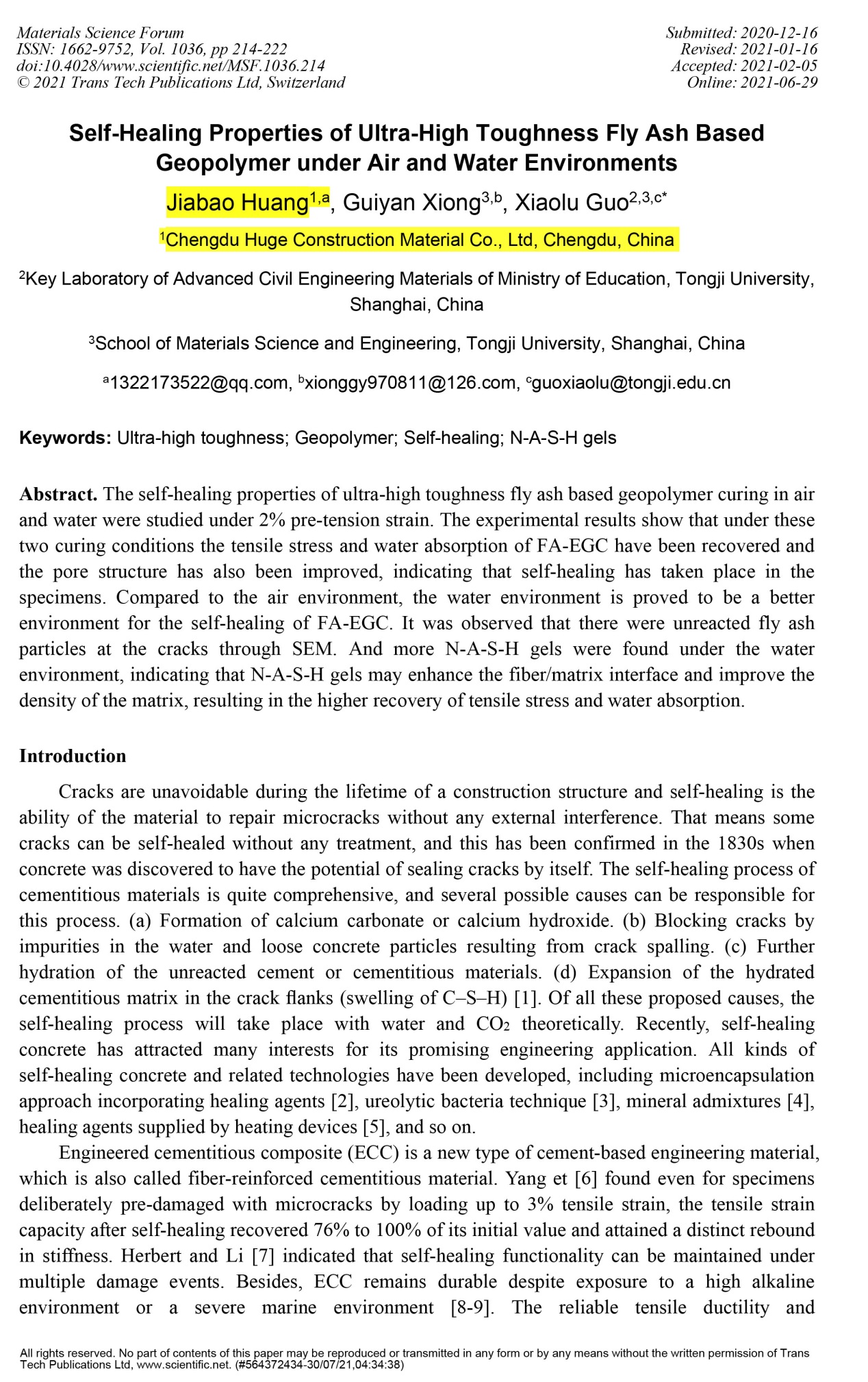 近日,我司技术团队成员黄加宝、通讯作者同济大学郭晓潞教授、合作作者同济大学熊归砚博士在期刊《Materials Science Forum》(EI收录)上发表论文《Self-healing Properties of Ultra-high Toughness Fly Ash Based Geopolymer under Air and Water Environments》。