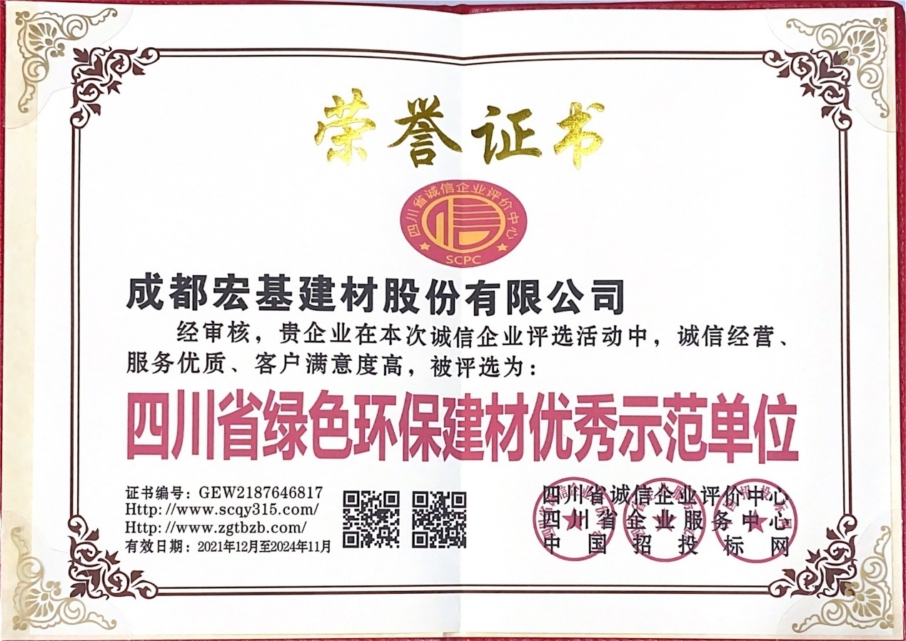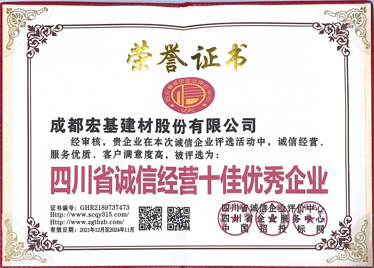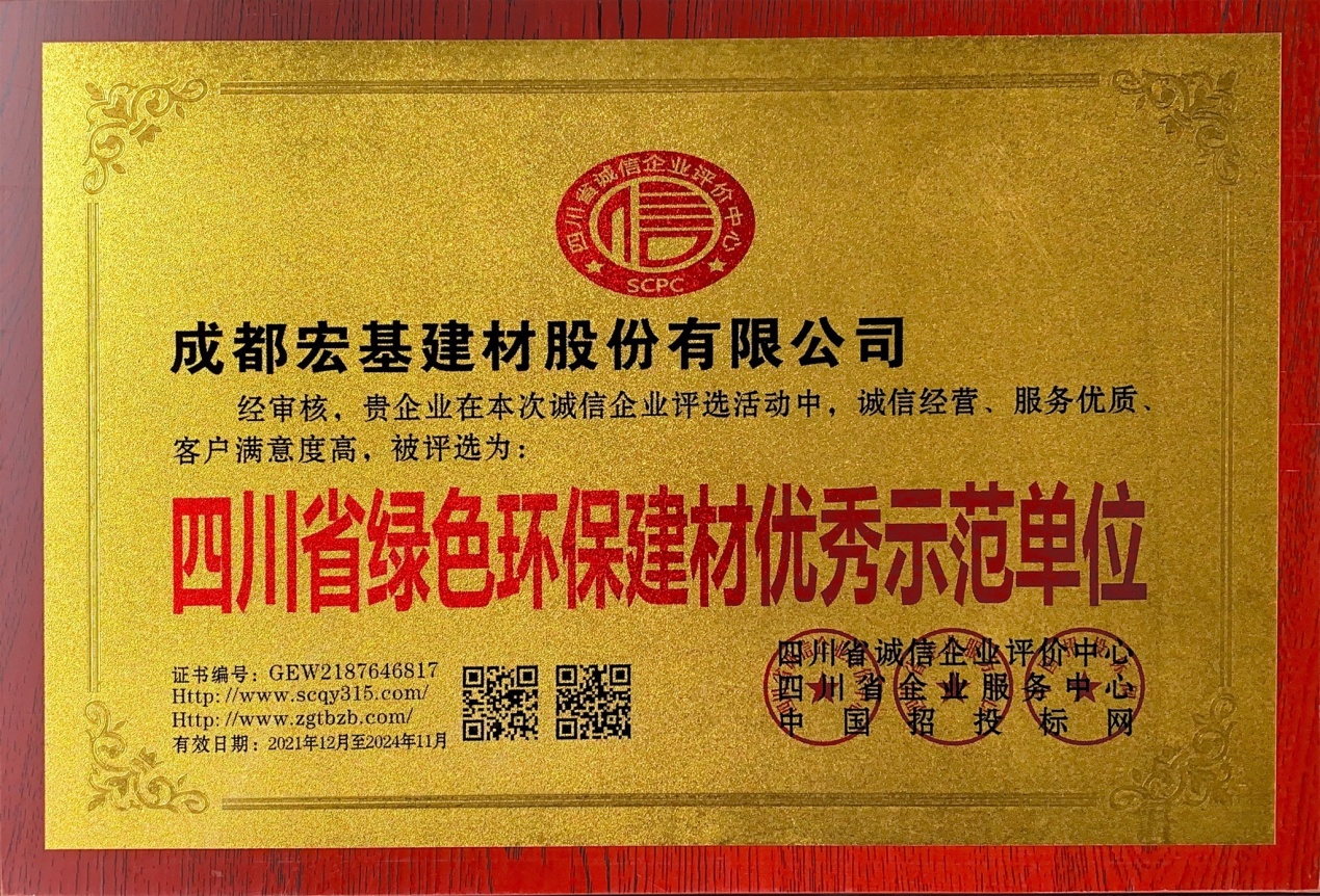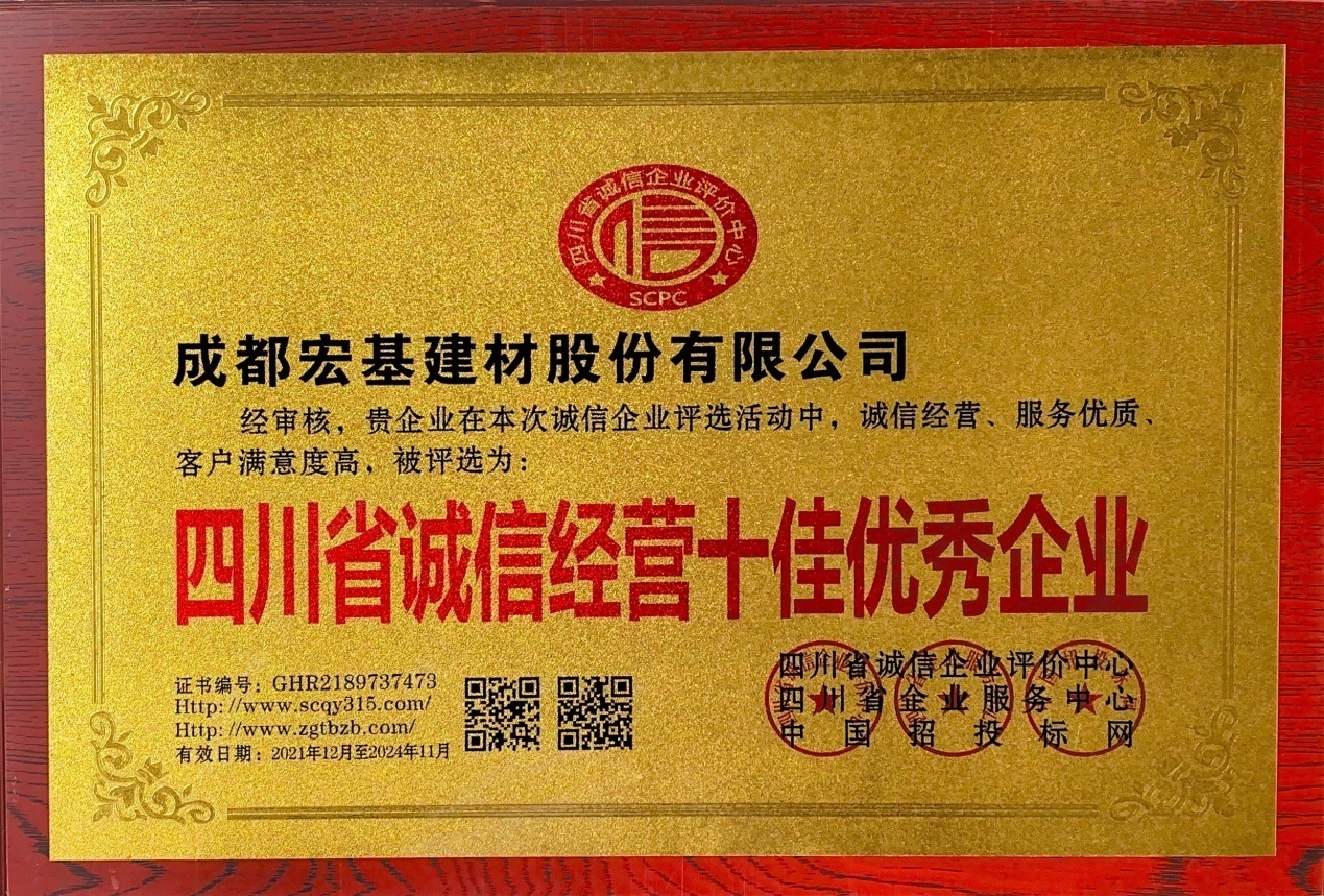 四川省诚信评选组委会秉承“公开、公平、公正”的原则,进行了系列审查评选,公司在本次评选活动中获得了“四川省诚信经营十佳优秀企业”、“四川省质量•信誉•服务三优企业”、“四川省绿色环保建材优秀示范单位”三项荣誉。