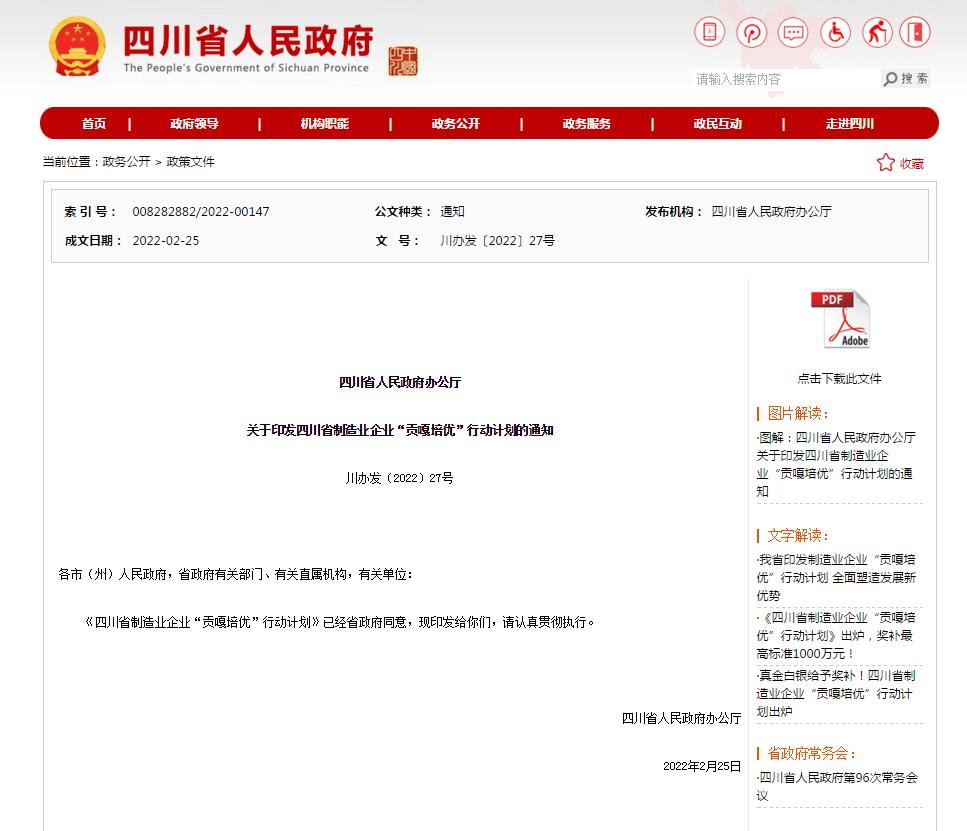 经企业自主申报、省国资委和各地区经济和信息化主管部门初核推荐、专家评审,四川省经信厅于2022年3月16日公示了四川省制造业“贡嘎培优”100户企业名单。根据《四川省制造业企业“贡嘎培优”行动计划》,将给予入围企业多方面的政策支持,助力其做大做强,实现可持续高质量发展。