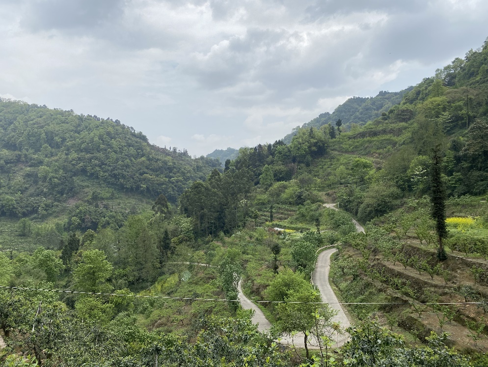 到达山顶后,山间小道变成了宽敞的柏油马路,向下望去,蒲江县城的风光尽收眼底。