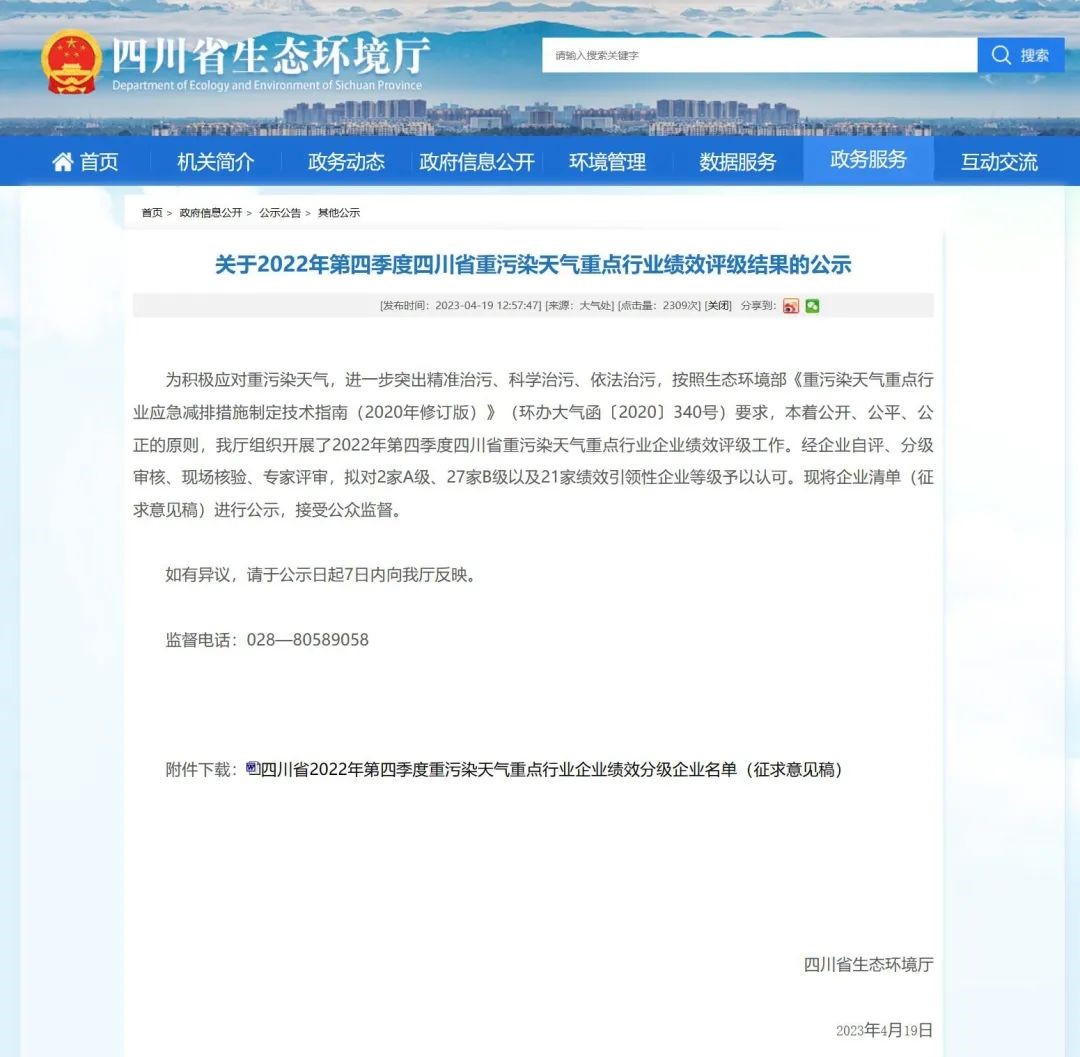 近日,四川省生态环境厅发布2022年第四季度四川省重污染天气重点行业绩效评级结果,我司蓉西分公司榜上有名。