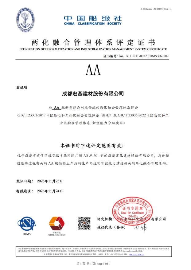 该项目2022年7月启动,为推动AA级混凝土产品的生产与运营管控能力建设,公司专门成立能力打造专项小组,全体bevictor伟德同仁积极参与到新型能力打造、实施过程,项目于2023年11月进入评定,经中国船级社质量认证公司的现场审核和两化融合评定工作委员会专家会审,公司AA贯标工作最终通过了评定审核,获得评定证书。