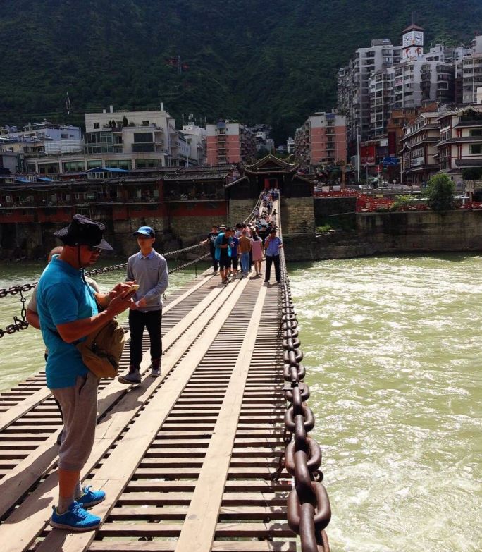 吃过早饭,我们便踏上了返程。途中我们来到了著名的红色旅游城市——泸定,大家上桥游览了泸定铁索桥,尽管此时的桥面已经修缮的相当安全了,但走在上面,看到桥下汹涌的洪水,也依然觉得十分害怕,更能体会到“金沙水拍云崖暖,大渡桥横铁索寒”的艰难。此刻我们回顾历史,敬仰英雄,感悟拥有和平时代的不容易。