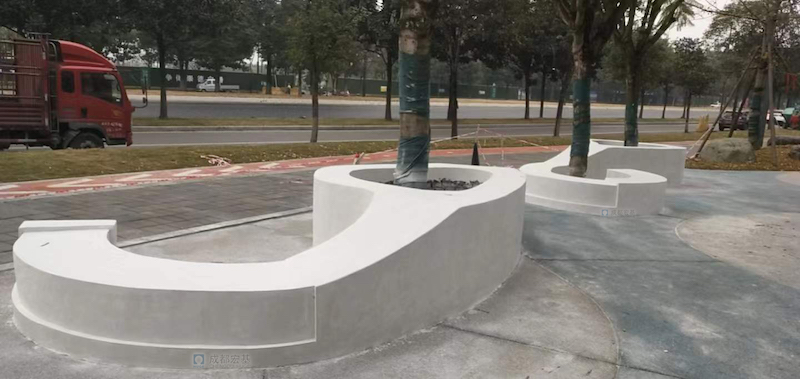 无机石是用水泥、玻璃纤维和高分子聚合物将特种艺术骨料胶结在一起后,通过打磨工艺制备而成的艺术混凝土产品。根据制备工艺不同,无机石产品可分为预制无机石和现浇无机石。预制无机石由模具成型后打磨制得,而现浇无机石则在项目现场通过浇筑打磨完成。无机石产品造型丰富,质感颜色多样,深受设计师的青睐,被广泛应用于市政公园、景点和绿地中。